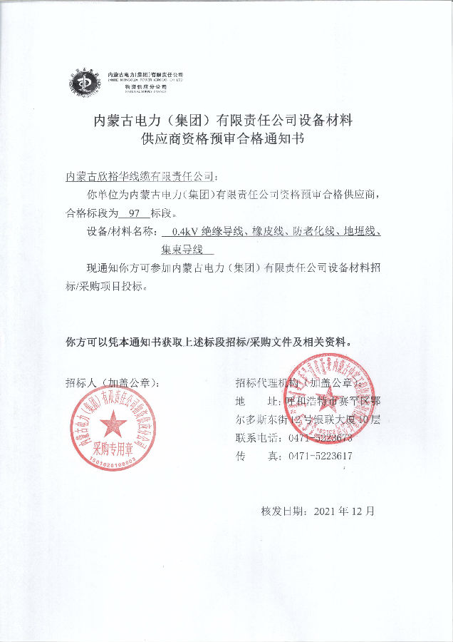 內(nèi)蒙古電力(集團)材料供應商資格預審合格通知書