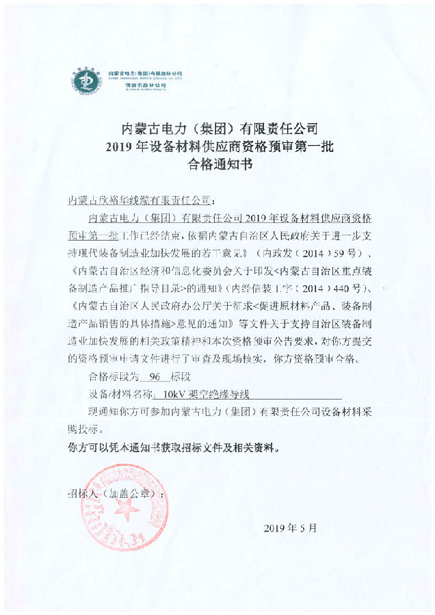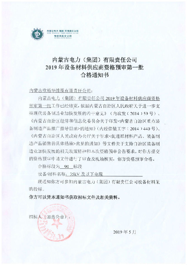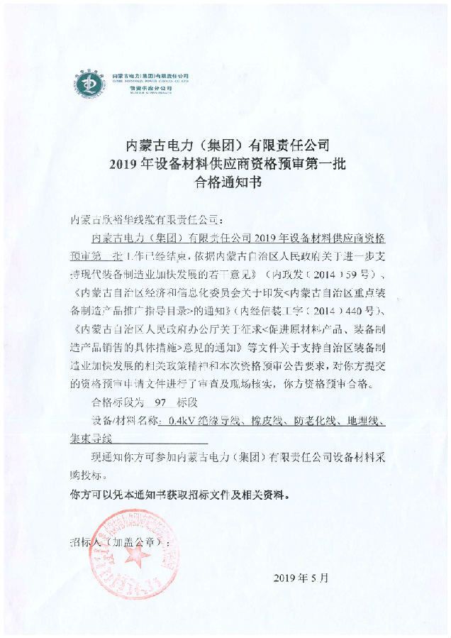 內(nèi)蒙古電力(集團)材料供應(yīng)商資格預(yù)審合格通知書